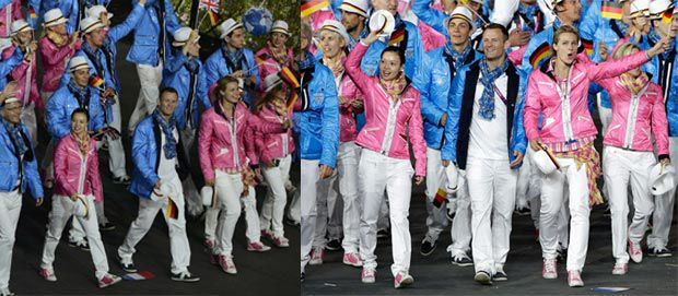 s’inspirait des boîtes de Tampax, mais à côté de toutes les catas optiques qui se produisaient dans le même temps, un pantalon hyper-absorbant avec applicateur passerait inaperçu. Tu peux tout d’abord noter que les Allemands ont visiblement eu peur que leurs athlètes se pèlent les miches chez les angliches, puisqu’ils ont opté pour le combo veste matelassée + écharpe en plein mois de juillet. Ou alors il s’agit d’un lapsus vestimentaire : les Allemands auraient préféré faire les J.O. d’hiver. Mais ce n’est rien, tu le sais bien, dirait Julien Clerc, à côté de ce qui blesse mon coeur de Zorro du marketing genré comme un bas de nylon filé au cran d’arrêt. Top du retour à la préhistoire : la palette de couleurs allemande, avec du rose pour les filles, et du bleu pour les garçons. Quelle imagination. Notons qu’avec ces sapes sur le coco, les sportifs ont autant de classe que des bâtonnets pour se gratter le cérumène.