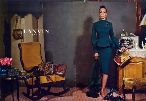 Oui, je sais, cette première madame a l’air aussi aimable qu’une porte de prison qui aurait bouffé du granit. Les campagnes Lanvin jouent plutôt sur le côté pince-sans-rire et n’ont pas encore atteint le stade ultime du « Si Ju va bien, c’est Juvamine ». Le décor et l’ambiance sont au chic strict, du genre « ramène pas tes pieds boueux sur le tapis ou ça va chauffer pour tes fesses ».