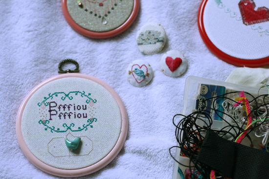 Ce que je préfère dans la broderie c’est que le travail est long, précis et rigoureux, mais que je peux l’effectuer devant Derrick, Plus belle la vie, 24 h, Gossip Girl et n’importe où, sur la route, dans le train, au parc. Le plus dur ce sont les crampes aux doigts, la vue qui baisse et le résultat qui n’est pas forcément représentatif du temps de travail.
