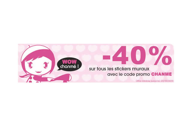 Avis à celles d’entre vous qui ont envie d’un peu de changement dans la déco de leur (au choix) appart/studio/chambre/bureau. Méchant Vinyl, une boutique qui vend du sticker mural propose une sympathique remise valable jusqu’au 22 mai prochain. Tu colles le code CHANME (comme méchant en jeune, ué tavu tranquille) avant de régler et zou, 40% de réduction sur tous les stickers muraux. Cétipabo, hein ?… Je réképépète : mechantvinyl.com. -40%. 22 mai. CHANME.