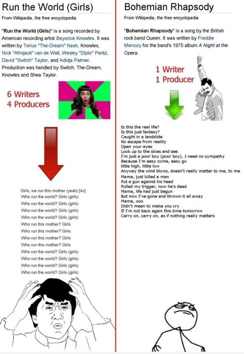 Run The World (Girls) = 6 compositeurs 4 producteurs – Bohemian Rhapsody = 1 compositeur 1 producteur