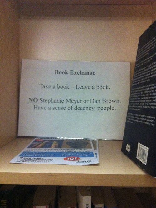 ECHANGE DE LIVRES : prenez un livre, laissez-en un. PAS de Stephenie Meyer ou de Dan Brown, un peu de décence, les gens.