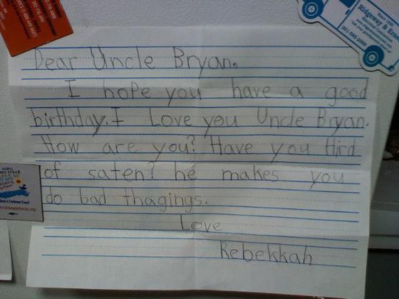 Cher Oncle Bryan, j'espère que tu passes un bon anniversaire. Je t'aime Oncle Bryan. Comment vas-tu ? As-tu entendu parlé de Satant ? Il te fait faire des mauvaises chozes. Love, Rebekkah.
