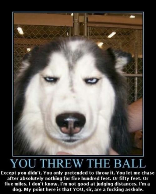 TU AS LANCE LA BALLE. Sauf que non. Tu as seulement fait semblant de la lancer. Tu m'as laissé courir après absolument rien sur 150 m. Ou 15m. Ou 15 km. Je n'en sais rien. Je ne suis pas doué pour les distances. Je suis un chien. Ce que je veux dire ce que TOI, monsieur, tu es un connard.