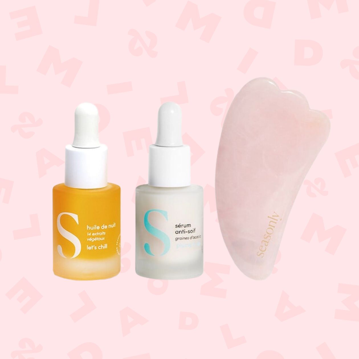 Sérum hydratant anti-soif et huile de nuit nourrissante s’allient à une pierre gua sha en quartz rose pour créer la routine du soir post-exposition au soleil parfaite ! Quand le sérum vient lutter contre la déshydratation en gardant l’eau dans les tissus cutanés, l’huile vient parfaire ses effets en créant un film occlusif à la surface de la peau. Quand au gua sha, il est parfait pour activer la micro-circulation du sang. Pas bête !