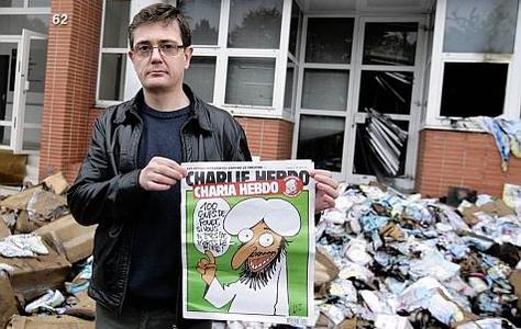 Charb, le directeur de la publication de Charlie Hebdo, sa couv' et les décombres