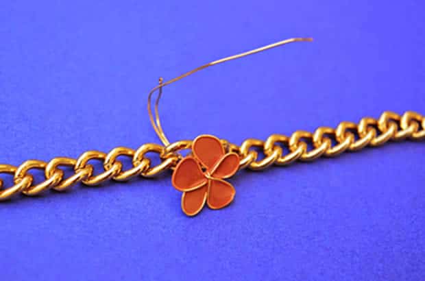 On passe à la fixation des fleurs sur la chaîne. C’est vraiment très facile puisqu’il suffit d’enfiler le fil de laiton dans un des maillons de la chaîne et de l’entortiller tout autour du maillon. Assurez-vous de bien serrer le fil pour que la fleur tienne correctement.