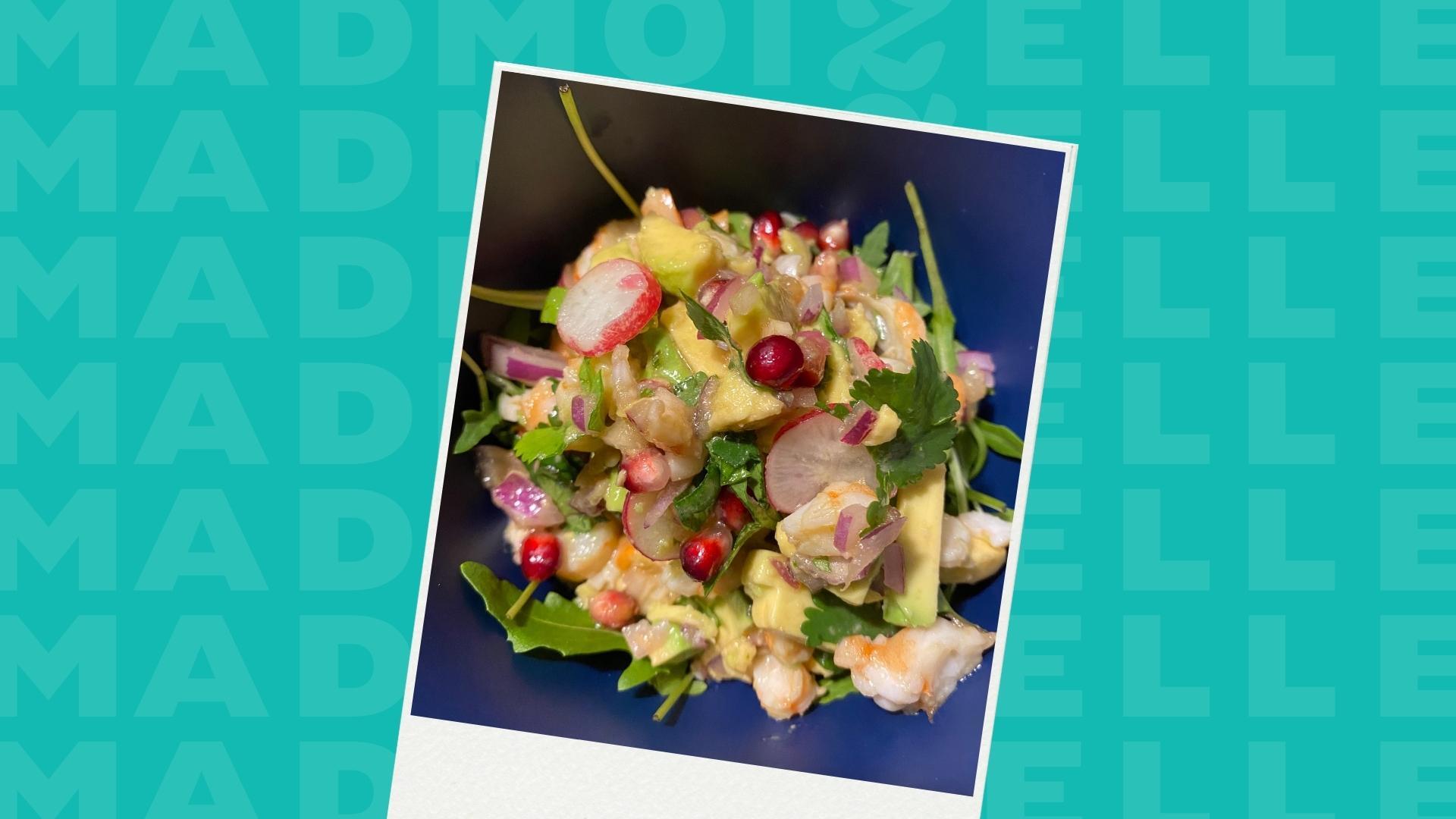 Il s’agit d’un splendide tartare de crevettes, citron caviar, grenade, radis et avocat, avec une petite sauce ponzu faite maison (mais vous pouvez tout à fait l’acheter toute prête dans le commerce).