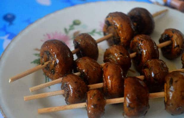 - Enfilez quelques champignons sur vos brochettes puis trempez-les dans la sauce au miel : il faut que les champis soient bien enduits de sauce.