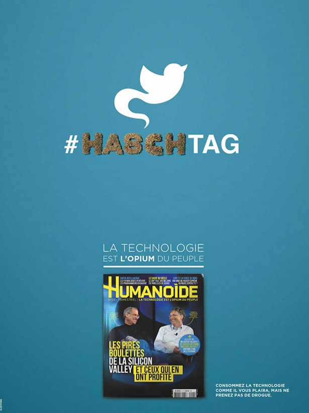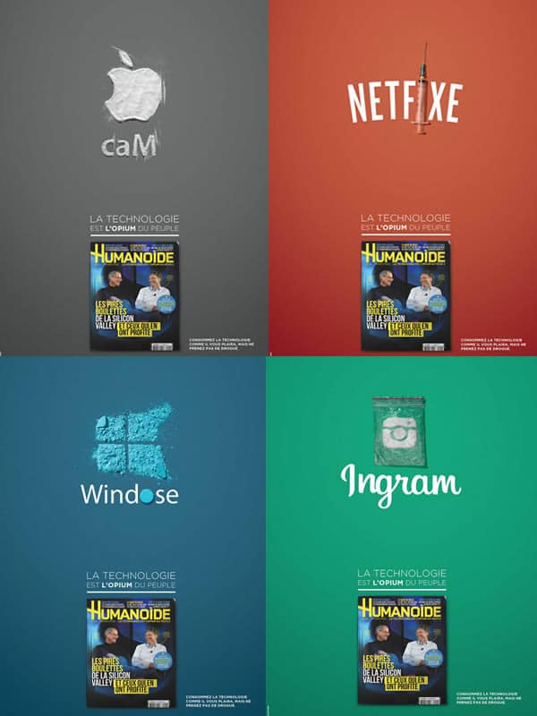 Le magazine Humanoïde lance une campagne qui détourne les noms et les logos des réseaux sociaux et des marques commercialisant les nouvelles technologies.