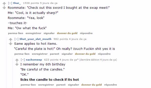 – Coloc : « Regarde cette épée que j’ai achetée à la foire ! » Moi : « Cool, elle coupe vraiment ? » Coloc : « Ouais, regarde » * touche l’épée * Moi : « Ow bordel de merde » – Ca s’applique aussi aux trucs chauds. « Attention cette assiette est brûlante ! » Oh vraiment ? * touche * Putain de merde oui vraiment – Ca me rappelle mon 6e anniversaire « Fais attention aux bougies. » « OK. » * lèche la bougie pour voir si c’est chaud *
