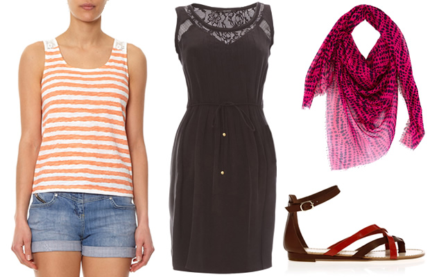 Débardeur rayé (14€ au lieu de 35€) – Robe en satin de soie et dentelle (43,90€ au lieu de 109€) – Foulard imprimé (10,80€ € au lieu de 45€) – Sandales (31,60€ au lieu de 79€)