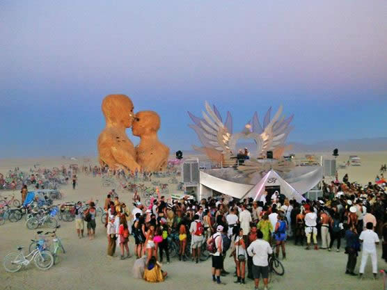 Environ 600 art-cars (chars à thème) circulent dans tous les sens au son de leur puissants sound systems. Les gens sautent d’une art-car à l’autre pour se diriger vers une œuvre d’art ou une party. L’étendue de la Playa est constellée d’œuvres sur lesquelles on peut grimper à plusieurs mètres du sol : des sculptures, des toboggans, des murs d’escalades, des escaliers…