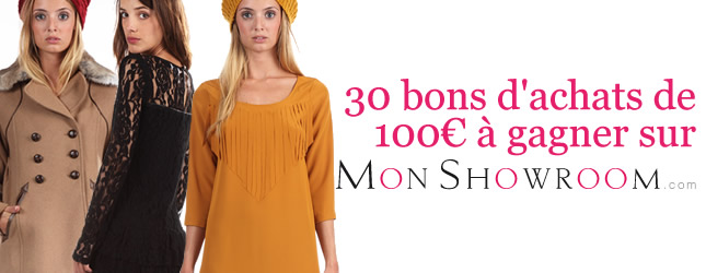 La pluie de bons d’achats continuent sur madmoiZelle. Venez participez au concours pour peut-être faire partie de celles qui recevront un bon d’achat d’une valeur de 100€ à dépenser sur MonShowroom, il n’y en a que 30 !