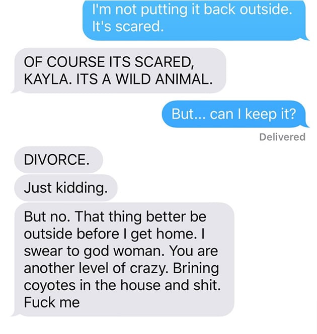 Kayla a le cœur gros comme ça, et du coup quand elle trouve un chien errant à sa porte, elle décide de l’adopter. Seulement voilà, le hic, c’est qu’en envoyant une photo du petit animal, son mari se rend compte qu’il s’agit… d’un coyote.
