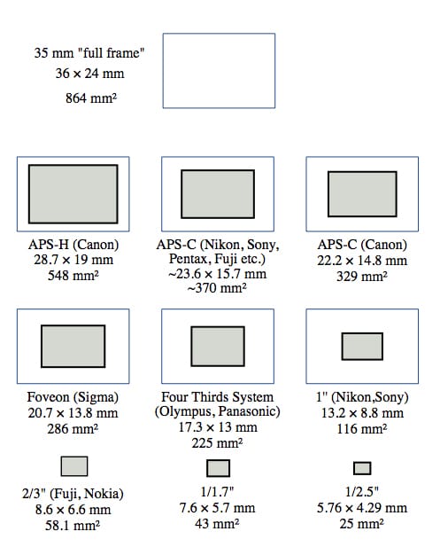 Ce schéma te fait peut-être mal à la tête, je te rassure : moi aussi. Il a cependant le mérite de montrer de façon simple les écarts de taille entre les différents capteurs.