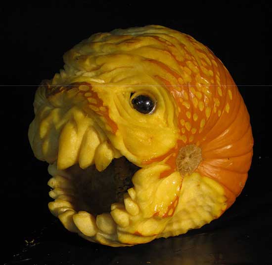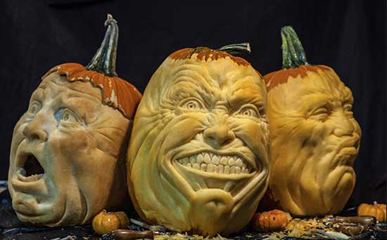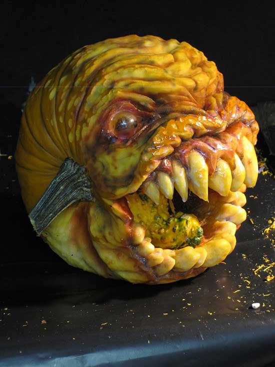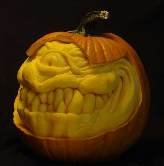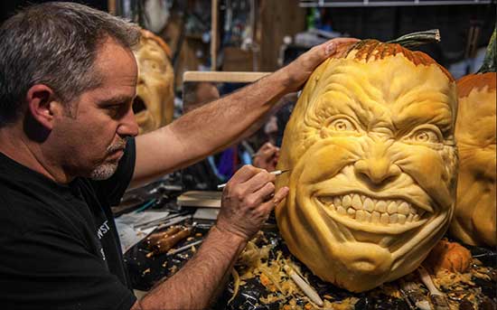 Jon Neill, un artiste américain est un véritable expert dans cet art : en effet, Jon réalise les citrouilles et cucurbitacées creusées, peintes et parfois accessoirisées les plus flippantes du monde, qu’il vend et réalise lors d’événements spéciaux.