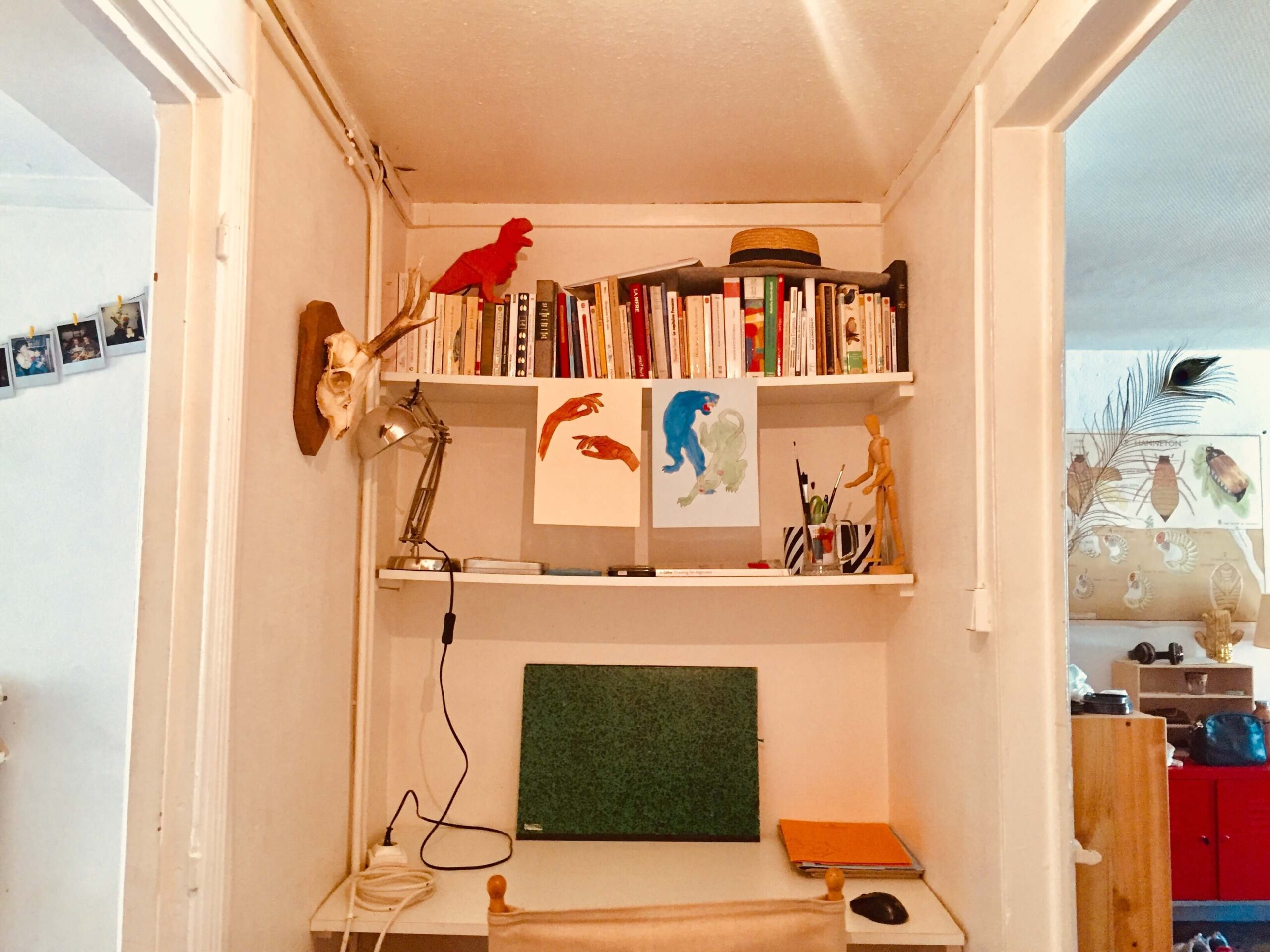 Alors… Absolument TOUT a été chiné/fabriqué/hérité/récupéré… mon credo dans la vie c’est seconde (voire troisième ou quatrième…) main, donc ça irait plus vite de présenter quelque chose de neuf. Mais pour l’exemple : j’ai récupéré une peinture inachevée d’un pélican derrière l’armoire de ma chambre quand j’étais en Erasmus à Budapest, il y a six ans. Depuis, il ne me quitte plus.