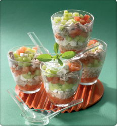 – Dans des verrines dresser une couches de thon, puis une de tomate, une de mozarella et une de concombre. Renouveler l’opération selon la taille des verrines.