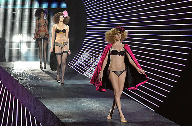 Vague mise en bouche d’Étam pour susciter l’émotion dans les slips (ça marche aussi (surtout) au masculin). Et le résultat fut à la hauteur. Plus qu’un défilé, le show s’est transformé en véritable showcase à plusieurs têtes : Mark Ronson, Beth Ditto, Joey Starr, The Kills, Janelle Monae, Boy Georges, Karen Elson et Spank Rock. Mixez tout ça à des filles en petite tenue et vous obtenez une salle en surchauffe. Mais l’expérience se révéla terriblement frustrante car impossible de TOUT voir : « les mannequins ou la danse extatique de Janelle, Janelle ou la lingerie affriolante ? merde merde merde ! » Sans parler de ma lutte constante entre les messages du patron (« à part ça, ça va la famille ? »), le rapport en direct live sur Twitter et mon bas qui se fout la malle : rien ne va plus.