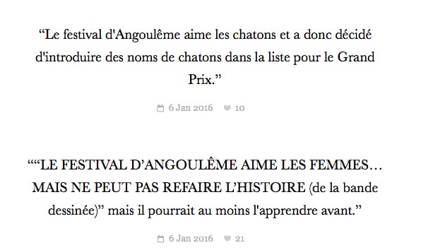 Le FIBD se fend alors d’une tribune intitulée « Le Festival d’Angoulême aime les femmes mais ne peut pas refaire l’histoire de la bande dessinée » dans lequel il explique que vraiment, pas une seule autrice (à l’international, rappelons-le) ne peut justifier d’une carrière suffisante pour prétendre au grand prix. Et que, de toute façon, quand des noms de femmes apparaissaient dans la liste, personne ne votait pour elles. Sympa.