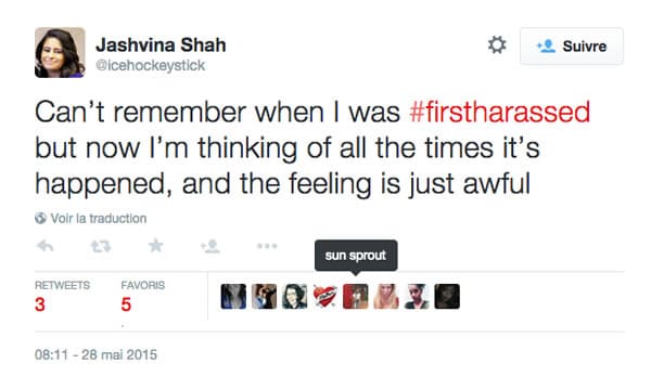 À la suite de ce message posté le 28 mai, plus de 7.000 tweets ont suivi accompagnés du hashtag #FirstHarrassed, véritable phénomène viral. Des milliers de femmes ont, à leur tour, raconté la première fois ou elles ont été victimes de harcèlement, de commentaires déplacés et sexistes, de sifflets et même d’agressions sexuelles.