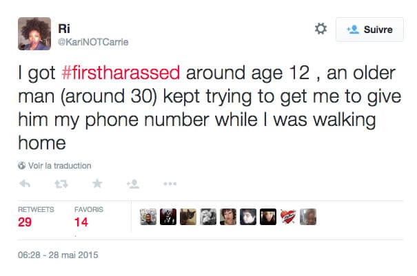 Des tweets dénoncent aussi le harcèlement de rue qui débute souvent très tôt dans la vie d’une femme.