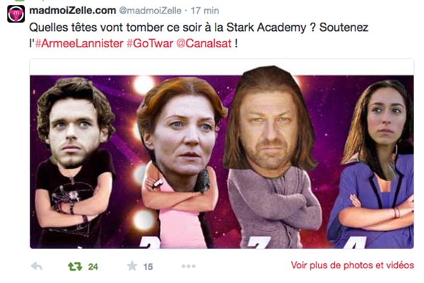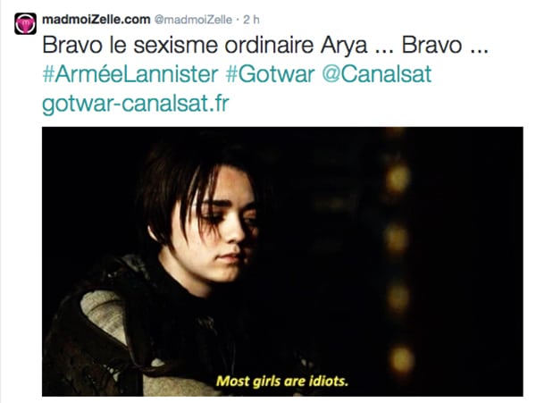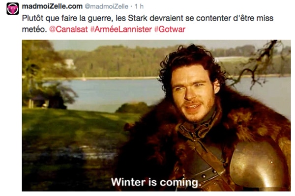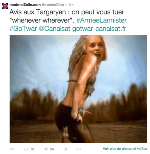 madmoiZelle participe à cette opération : on fait partie des Lannister (parce qu’ils payent toujours leurs dettes,: on s’est dit que c’était plutôt pas mal d’être réglo du point de vue de nos impôts tout ça, et puis chez les Stark il fait trop froid) ! On va donc poster des tweets pour « attaquer » les autres familles. Si vous nous retweetez, vous devenez un•e de nos soldat•e•s. Si on a plus de soldats que nos adversaires, on gagne la bataille !