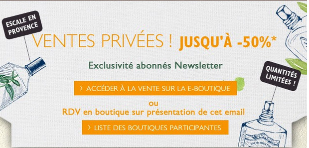 Montant de la réduction : jusqu’à 50% parmi une sélection de produits Sur : www.loccitane.fr Jusqu’au : mardi 24 juin 2014 Livraison : offerte lors de votre 1ère commande avec le code promo BIENVENUE