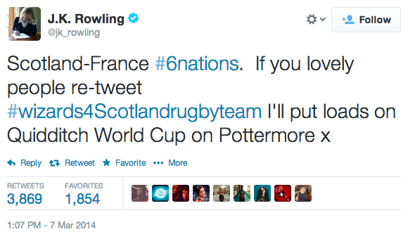 « Écosse-France, #SixNations. Vous seriez adorables de retweeter #wizards4Scotlandrugbyteam, et je publierai plein d’infos sur la Coupe du Monde de Quidditch sur Pottermore »