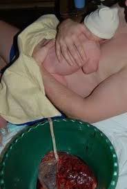 Mon préféré, le meilleur pour la fin : le placenta conservé dans le cadre d’une expérience de « bébé-lotus ». Le bébé-lotus, qu’est-ce donc ? Serait-ce un joli bébé joufflu et souriant sortant d’une fleur de lotus façon Anne Geddes ? Pas exactement. Concept cher aux materneuses, le « bébé lotus » est une pratique consistant à ne pas séparer l’enfant du placenta à la naissance. Autrement dit, on ne coupe pas le cordon. Estimant que cet acte constitue une forme de violence inouïe infligée au nouveau-né (que l’on coupe littéralement et subitement de sa mère), les adeptes de cette pratique revendiquent la nécessité de laisser la nature faire les choses et donc d’attendre patiemment que le cordon, ainsi relié au placenta, se désolidarise de lui-même de l’enfant. Et concrètement, qu’est-ce que cela donne ? Un morceau de viande en putréfaction relié à un nouveau-né. C’est touchant-trognon-mignon, je sais. Je m’imagine en train de porter mon bébé-lotus, le déposant ensuite dans les bras de son papa en signalant à ce dernier « Oups, fais gaffe, tu marches sur le placenta ! ». J’imagine l’effet bœuf que ferait mon bébé-lotus ainsi présenté à la famille : « Voilà les enfants, je suis très heureuse de vous présenter votre petit frère ! Et ce truc sanguinolent ? Oh, c’est rien du tout, c’est son placenta. C’est la nature, c’est beau, c’est la vie, maintenant soyez mignons et allez chercher une serpillère à maman, y a le placenta qui suinte là ».