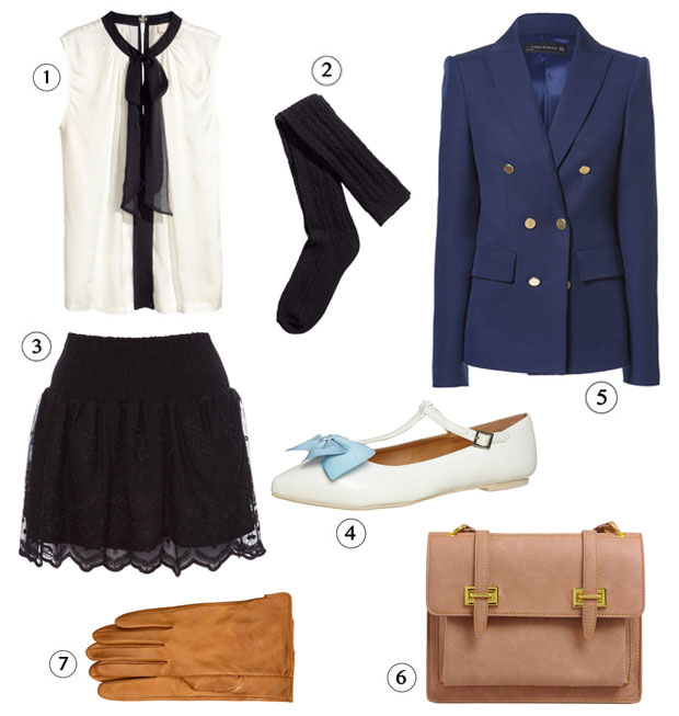 1) Blouse imprimée H&M (34,95€), 2) chaussettes montantes H&M (7,95€), 3) jupe en dentelle Pull&Bear (25,99€), 4) babies blanches à bride et noeud Shelly’s London (36,00€), 5) veste de blazer Zara (14,99€), 6) sac cartable Galeries Lafayette (30,00€) et 7) gants en cuir H&M (19,95€)
