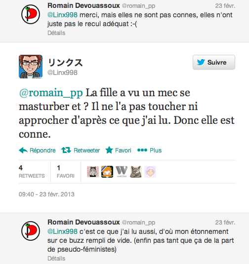 Ou quand un mec fait une blague sexiste qui ne fait pas rire une féministe et qu’il lui répond quelque chose comme « les féministes n’ont pas d’humour ? ». Ou quand une fille raconte qu’elle a été harcelée dans la rue et qu’elle se voit répondre qu’elle devrait être flattée d’être courtisée, ou remettant en cause ce qu’elle a vécu, comme on a pu le voir dans la discussion entre La Marquise et quelques membres du Parti Pirate.