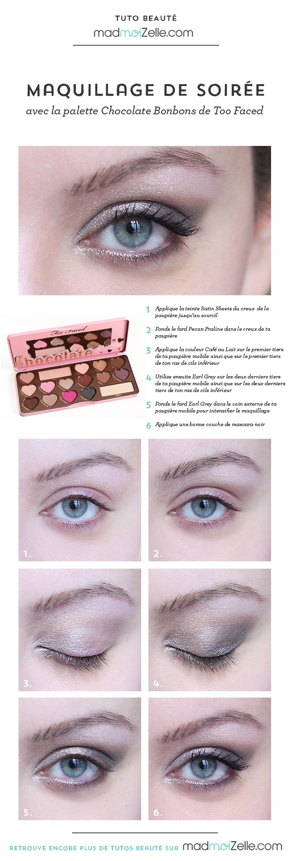 Pour l’occasion, Virginie te propose de réaliser un maquillage de soirée aux tons neutres avec la nouvelle palette Chocolate Bonbons de Too Faced. Allez, prends tes pinceaux et c’est parti ! Tu vas voir, c’est bête comme chou.