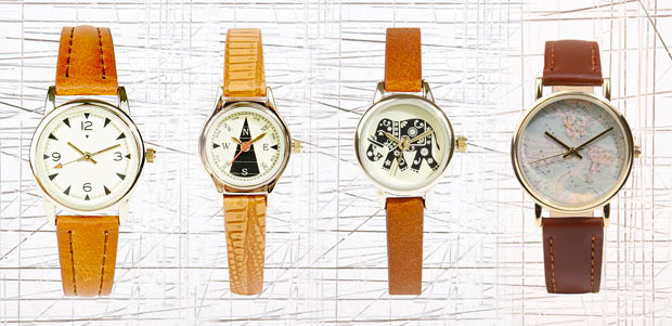Pour les amatrices de montres faussement rétro, vous pouvez aller jeter un oeil de côté du concept store Urban Outfitters qui propose des chouettes modèles avec des bracelets en cuir et des motifs anciens comme des mappemondes, des boussoles ou des triangles.