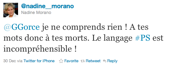 C’est à cela que ressemble son compte twitter : on y trouve des torchons et des serviettes entremêlées, elle y parle politique, glorifie notre bon président, apostrophe les dirigeants du PS, nous raconte heures par heures son réveillon, se venge des méchants qui se moquent d’elle.