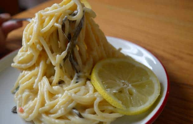 - Mettez vos pâtes dans la grosse casserole (ou la marmite : ce que vous avez quoi). Comme elles sont un peu tristes toutes seules, rajoutez l’oignon blanc en morceaux, la ciboulette ciselée et une moitié de citron coupée en tranches.