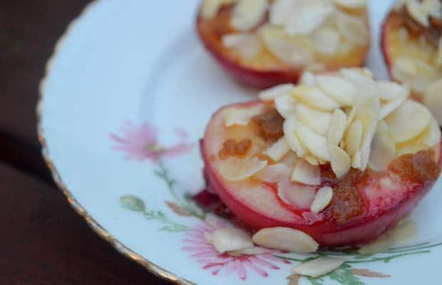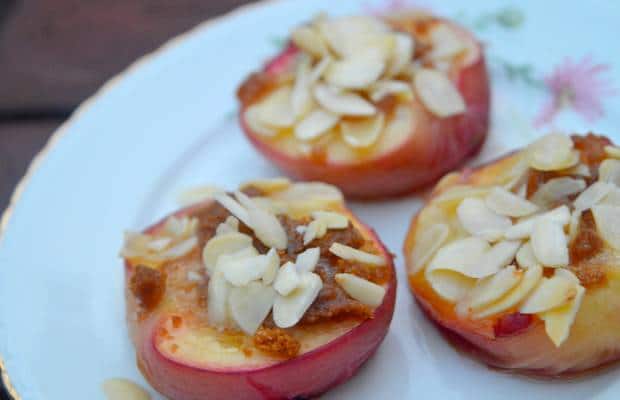 Les pêches on leur dit oui, alors quand elles sont rôties au miel, aux amandes et au spéculoos on écrit oui en lettres de feu dans le ciel étoilé.