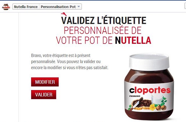 La marque propose aux clients qui ont liké la page Facebook « Nutella France » (rien n’est gratuit en ce bas monde) de personnaliser l’étiquette d’un pot classique de 825 grammes en remplaçant le logo « Nutella » par leur prénom, pourvu qu’il tienne en 9 caractères (ce qui exclut donc « jadorelhuiledepalme » ou « viveladeforestation » c’est ballot). Apparemment l’étiquette est expédiée sous 2 à 3 semaines (donc j’imagine qu’il faut aussi communiquer son adresse)