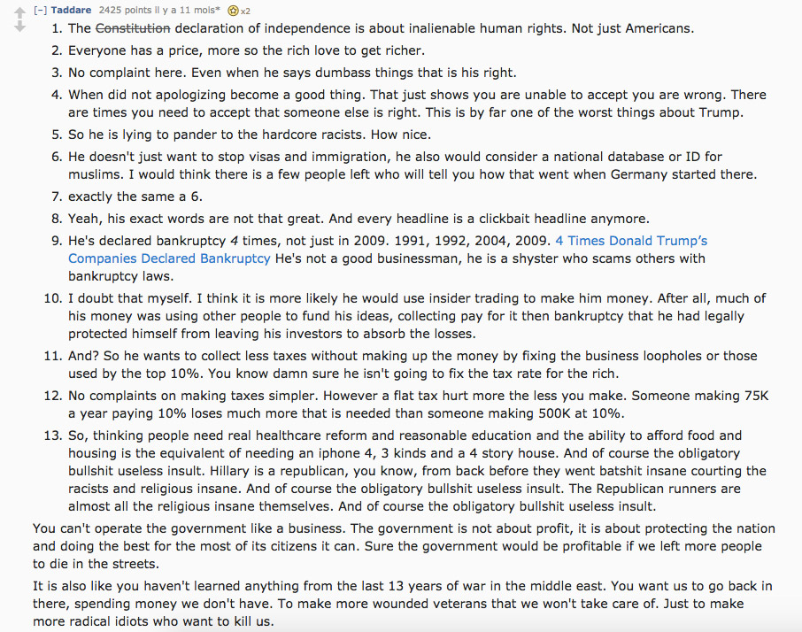 Moi, et apparemment une grande partie de l’Amérique, nous sommes d’accord pour dire qu’il faut sacrifier le fait d’être gentil dans l’espoir de régler une grosse partie de la merde actuelle. […] Vous ne voyez pas les soutiens de Trump sur Reddit parce que c’est un endroit où se reproduisent les socialistes. »