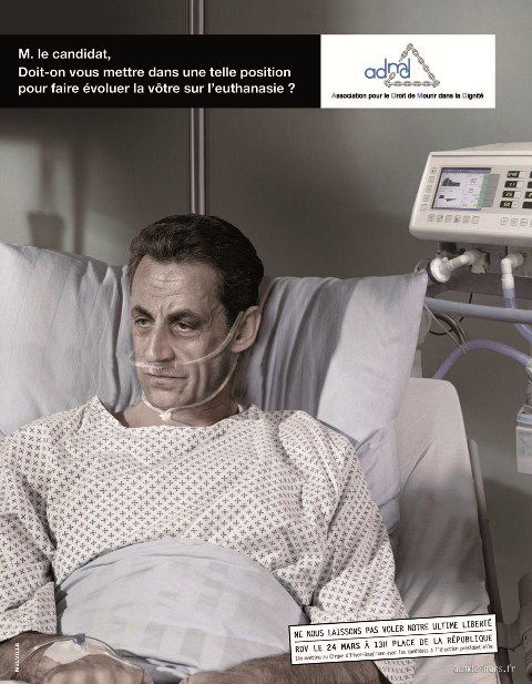 Les affiches que surplombe à chaque fois la mention « Monsieur/Madame le/la candidat(e), doit-on vous mettre dans un telle position pour faire évaluer la vôtre sur l’euthanasie ? » seront publiée demain dans les Inrocks.