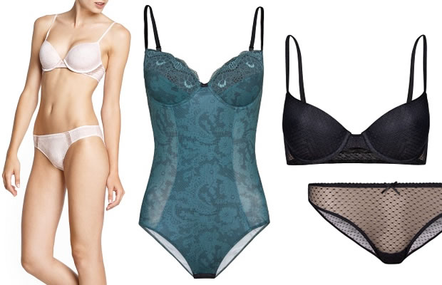 Ensemble rose pâle : Soutien-gorge (14,99€ au lieu de 22,99€) et culotte (8,99€ au lieu de 12,99€) – Body push-up vert (19,99€ au lieu de 29,99€) – Ensemble noir plumetis : Soutien-gorge (14,99€ au lieu de 22,99€) et culotte (8,99€ au lieu de 12,99€)