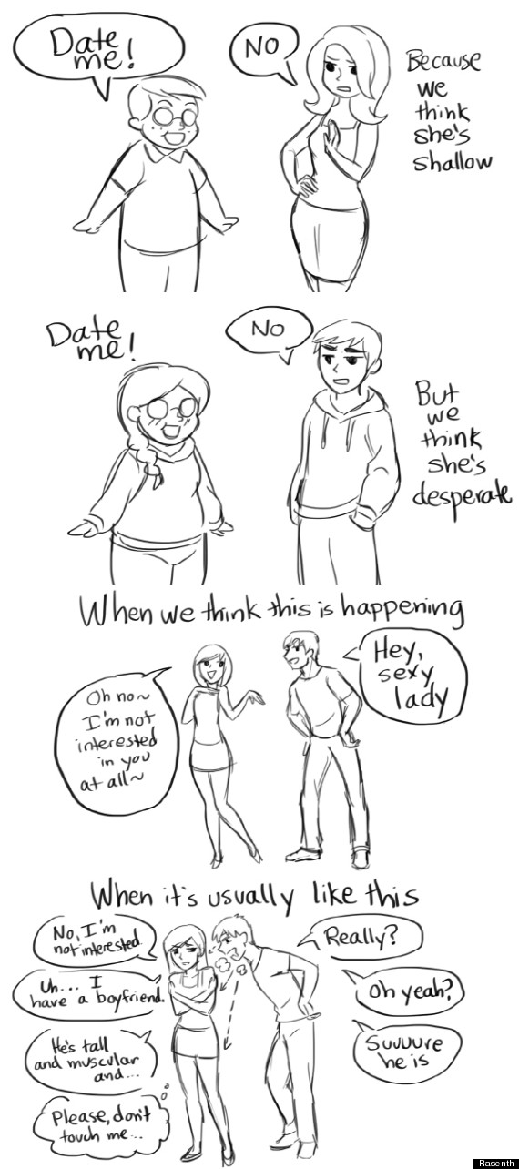 Quand en réalité c’est plus comme ça: – Non, je ne suis pas intéressée – Vraiment ? – Heu j’ai un petit ami. – Ah oui ? – Il est grand et musclé et… – Bien sûr… – S’il te plaît, ne me touche pas…