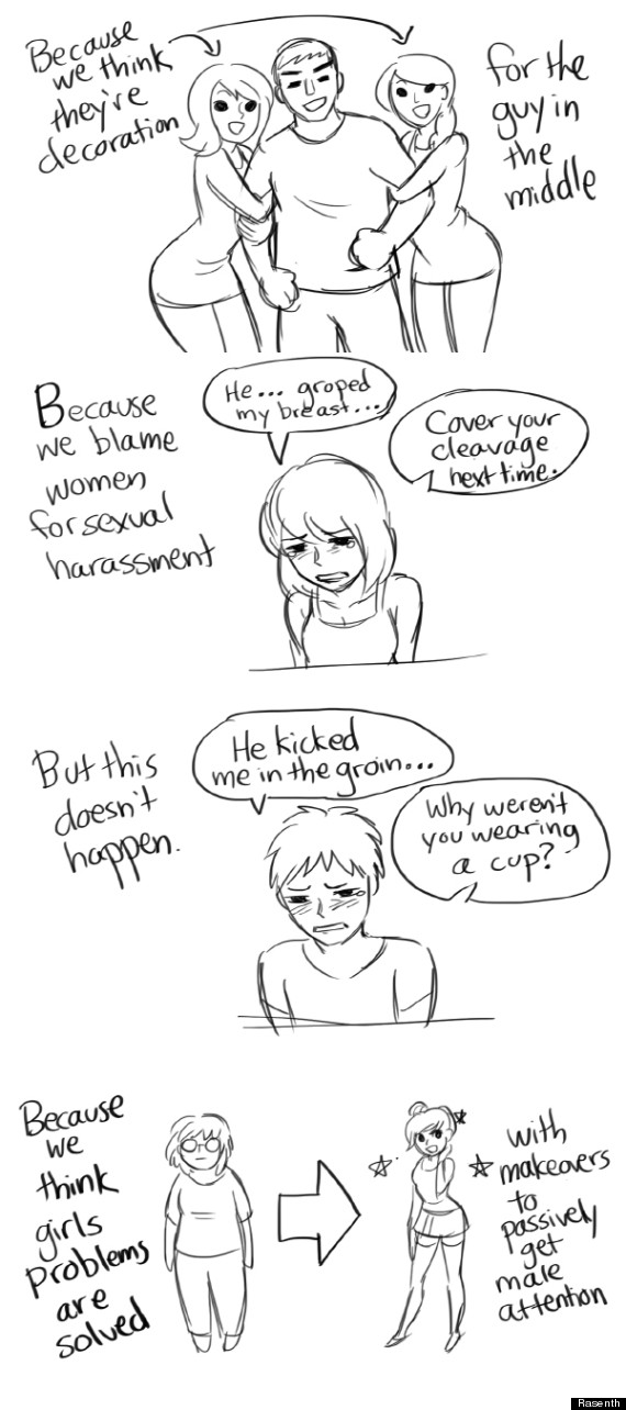 Parce qu’on accuse les filles d’être responsables si elles sont harcelées sexuellement. – Il m’a attrapée les seins. – Couvrez votre décolleté la prochaine fois !