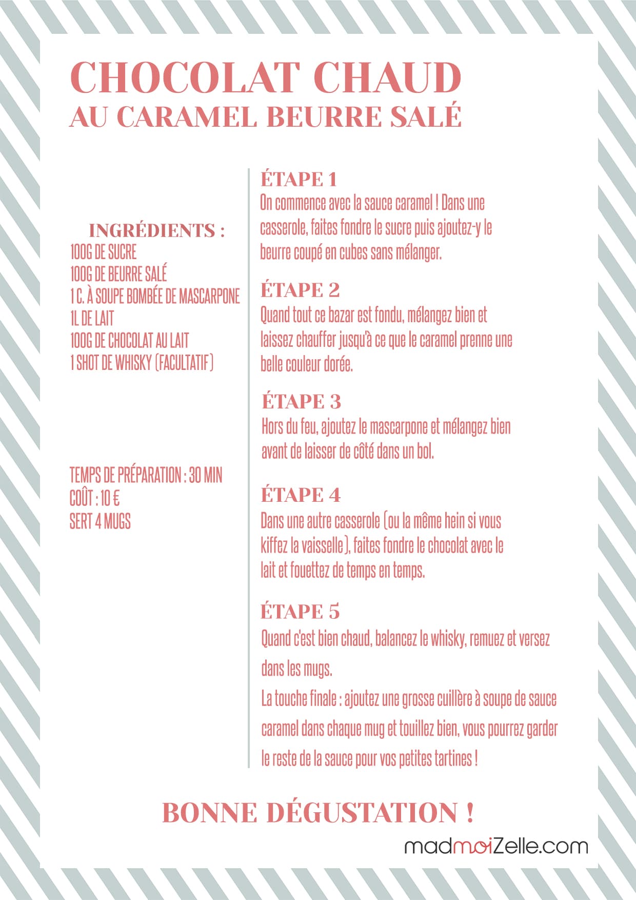 Du coup, quoi de mieux que de s’octroyer un lazy sunday à s’écouter un album de Nat King Cole sous un petit plaid tout doux, en sirotant un chocolat chaud du tonnerre ? Ca tombe bien, parce que je t’ai préparé une recette au top qu’Aliénor a illustrée !