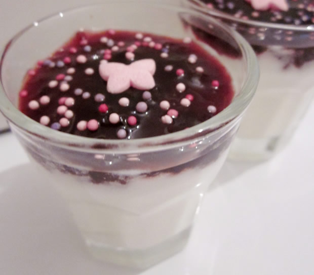 Le montage de mousse à la ricotta fondante à la cerise noire : Tu verses la mousse à la ricotta dans deux verrines et tu ajoutes la confiture à la cerise noire. Tu peux parsemer dessus quelques décors en sucre Vahiné.