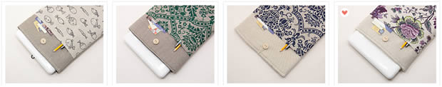 Comme sur la boutique précédente, la majorité des modèles de la boutique sont pour des produits Apple, mais il ne faut pas hésiter à contacter les vendeurs pour des modèles sur mesure, ils sont en général ravis de répondre à vos demandes. Blucase propose des housses un peu plus élaborées, puisqu’elles sont munies de poches à l’avant pour glisser des crayons, ou de petits documents (cartes diverses, etc). La poche est faite en tissu coloré, mais la structure de la housse est en lin de très bonne qualité, ce qui lui donne un look épuré vraiment joli. Une housse coûte en moyenne autour de 20€, mais pendant le mois d’octobre elle fait une liquidation, avec pas mal de modèles à -40% (rubrique SALE -40 percent) !