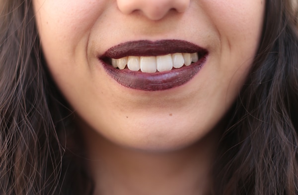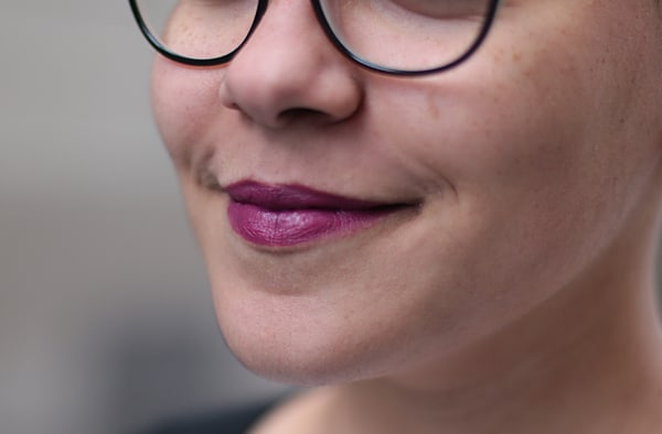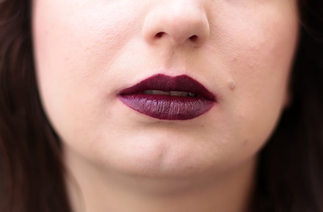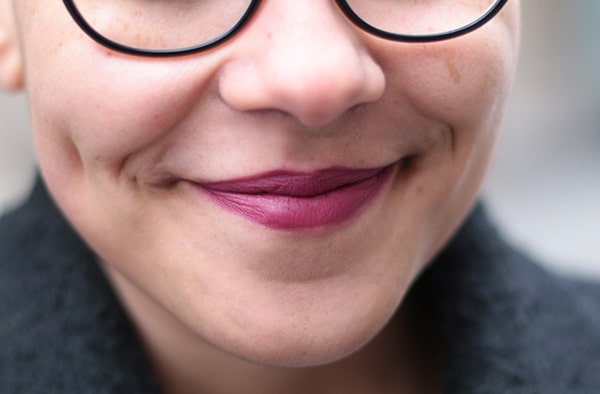 Jean-Monique porte le rouge à lèvres liquide Vivid Matte Liquid Color Sensational de Maybelline, dans la teinte « Possessed Plum » (10,90€).