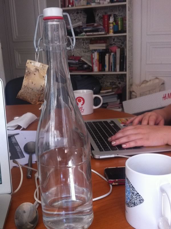 15h02 – J’accroche un sachet de thé à ma bouteille d’eau en verre. « Regarde, ça fait comme une boucle d’oreille, héhé. Elle en a qu’une », que je dis. « C’est Bernard Lavilliers ma bouteille d’eau. » J’attends les éclats de rire des collègues totalement soufflées par la force de mon humour. Il va sans dire que cette blague étant incompréhensible pour qui n’est pas moi, ils n’arrivent pas.