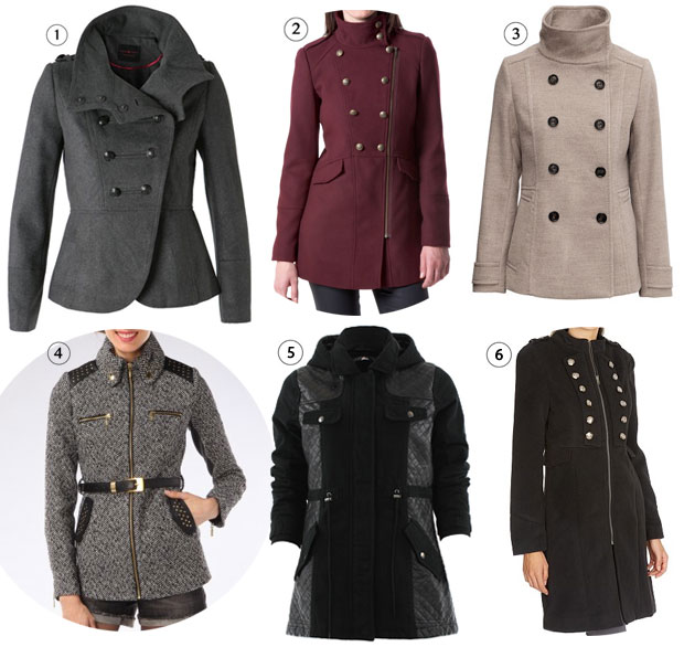 1) Manteau officier Cache-Cache (33,59€), 2) manteau bordeaux Promod (59,95€), 3) manteau col haut H&M (39,95€), 4) manteau cintré La Halle (65,00€), 5) parka bi-matière Mim (59,99€), 6) caban double boutonnage Kiabi (49,99€)